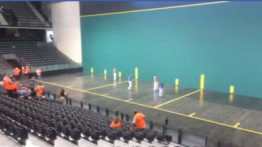Pamplona, 17 de julio de 2018. Las puertas de Navarra Arena se han abierto para presentar a los medios de comunicación el frontón recientemente finalizado. Los pelotaris de Olaizola II y Mariezkurrena II de Asegarce e Irribarria y Martija de Aspe han sido los encargados de probar la cancha, por primera vez, ante los medios de comunicación. Las sensaciones han sido positivas.