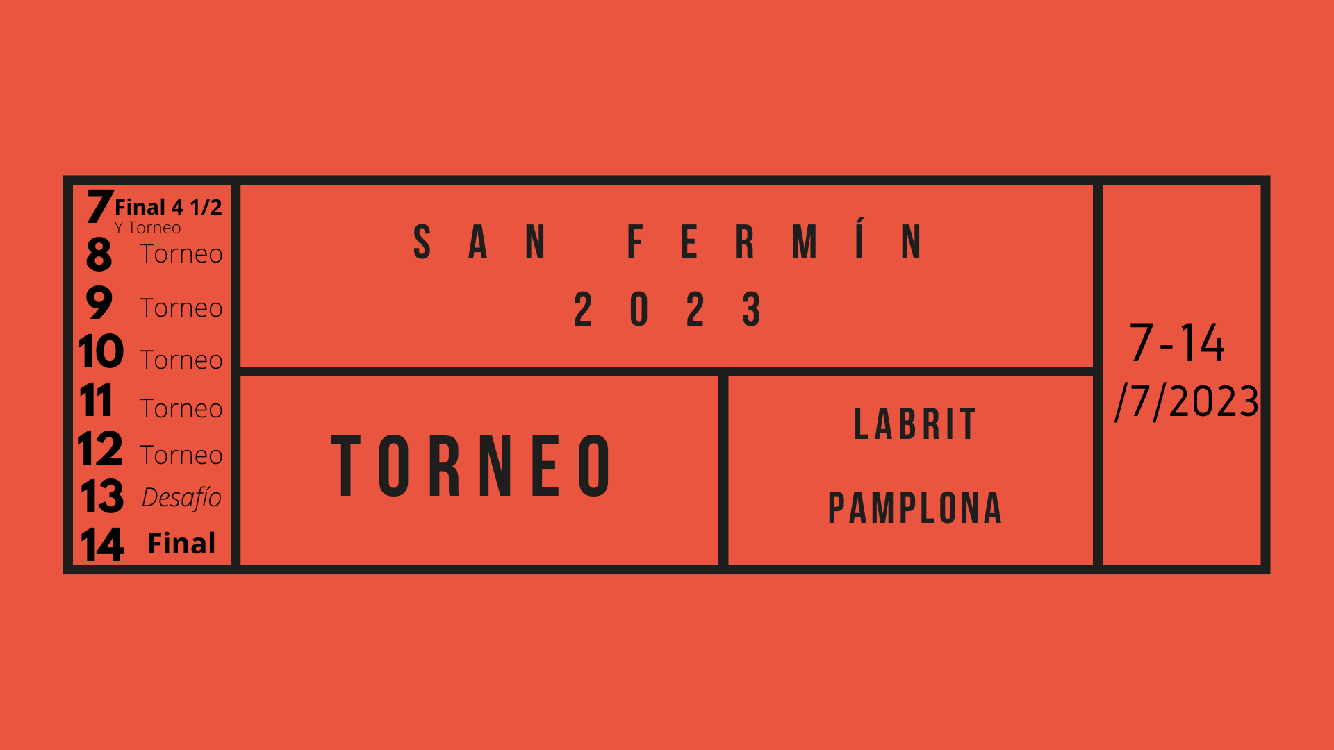 El 7 de julio, por la noche, arrancará la competición por parejas que se desarrollará también los días 8-9-10-11-12. El 13 tendrá lugar el Desafío Urzante, y la final del Torneo San Fermín se disputará el 14 de julio.