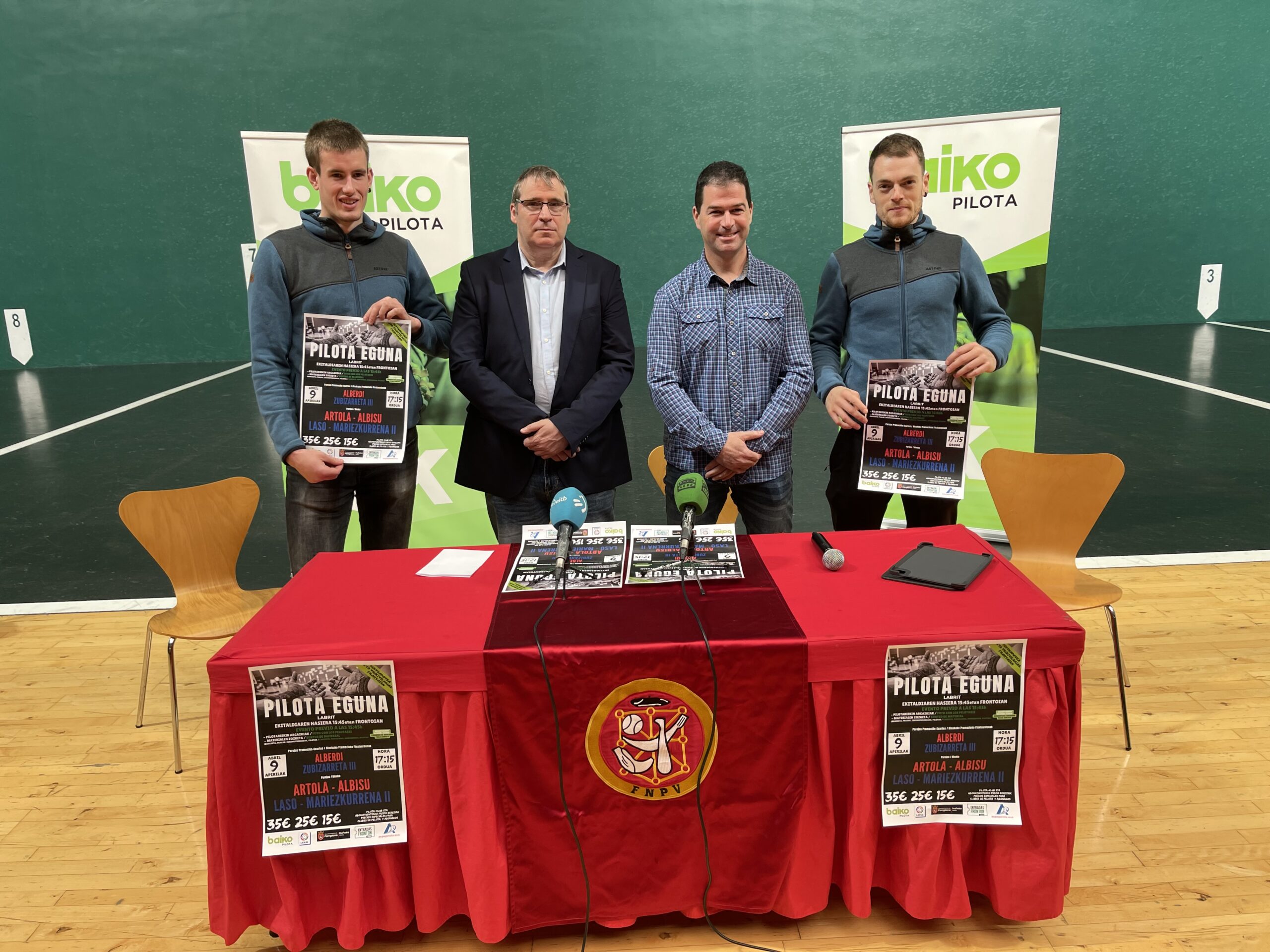 En la presentación llevada a cabo en el frontón navarro han participado Unai Iglesias, director comercial de Baiko Pilota; Javier Conde, Presidente de la Federación Navarra de Pelota; y los pelotaris de Baiko Unai Laso y Jon Mariezkurrena.