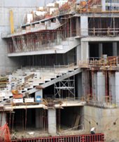 Argazkiak gaur bertan hartuak dira eta ikusten denez harmailak eta frontisa egiten hasiak dira 2.801 toki izango dituen frontoi erraldoi honetan.