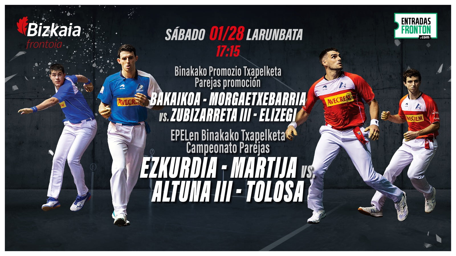 Larunbat honetan Ezkurdia-Martija eta Altuna III-Tolosa bikoteen arteko norgehiagoka jokatuko da Bizkaia Frontoian. Lehenengoak goiko multzotik ez aldentzeko asmoz kantxaratuko dira, eta bigarrenak euren egoera hobetzeko asmoz.