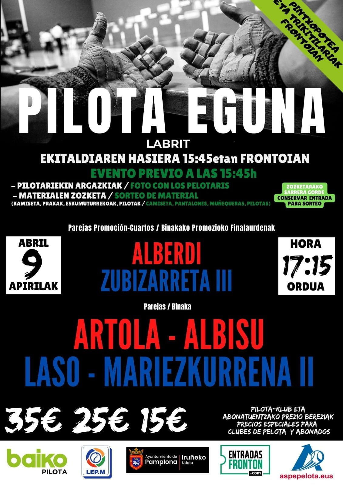 Labriteko ateak 15:45ean irekiko dira eta gaztetxoek pilotan jokatu eta argazkiak atera ahal izango dituzte jaialdiko pilotariekin.