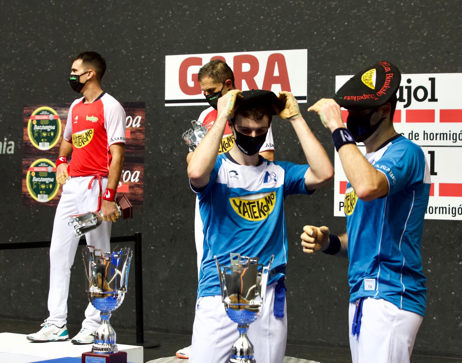 Gaur arratsaldean Bizkaia Frontoian jokatu duten Eskuz Binakako txapelketako finalean 13-22 galdu dute Olaizola II-Urrutikoetxeak Ezkurdia-Martijaren aurka. Tanto gogorrak jokatu dituzte lau pilotariek eta orotara 900 pilotakada jo dituzte. Markagailuan berdinketa ugari izan dira partidaren hasieran (3-3, 4-4, 5-5, 6-6, 7-7), baina urdinek 9 tanto egin dituzte jarraian eta partida haustea lortu dute. Azkenean, garaipena eta Eskuz Binakako txapela Ezkurdia eta Martijarentzat. Aurreneko partidan, Peña II-Ladis Galarzak 15-22 irabazi dute Dario-Salaverri II.aren aurka. Eta hirugarren eta azken partidan, Larrazabal-Urretabizkaia II.ak 12-18 garaitu dituzte Egiguren V-Tolosa.