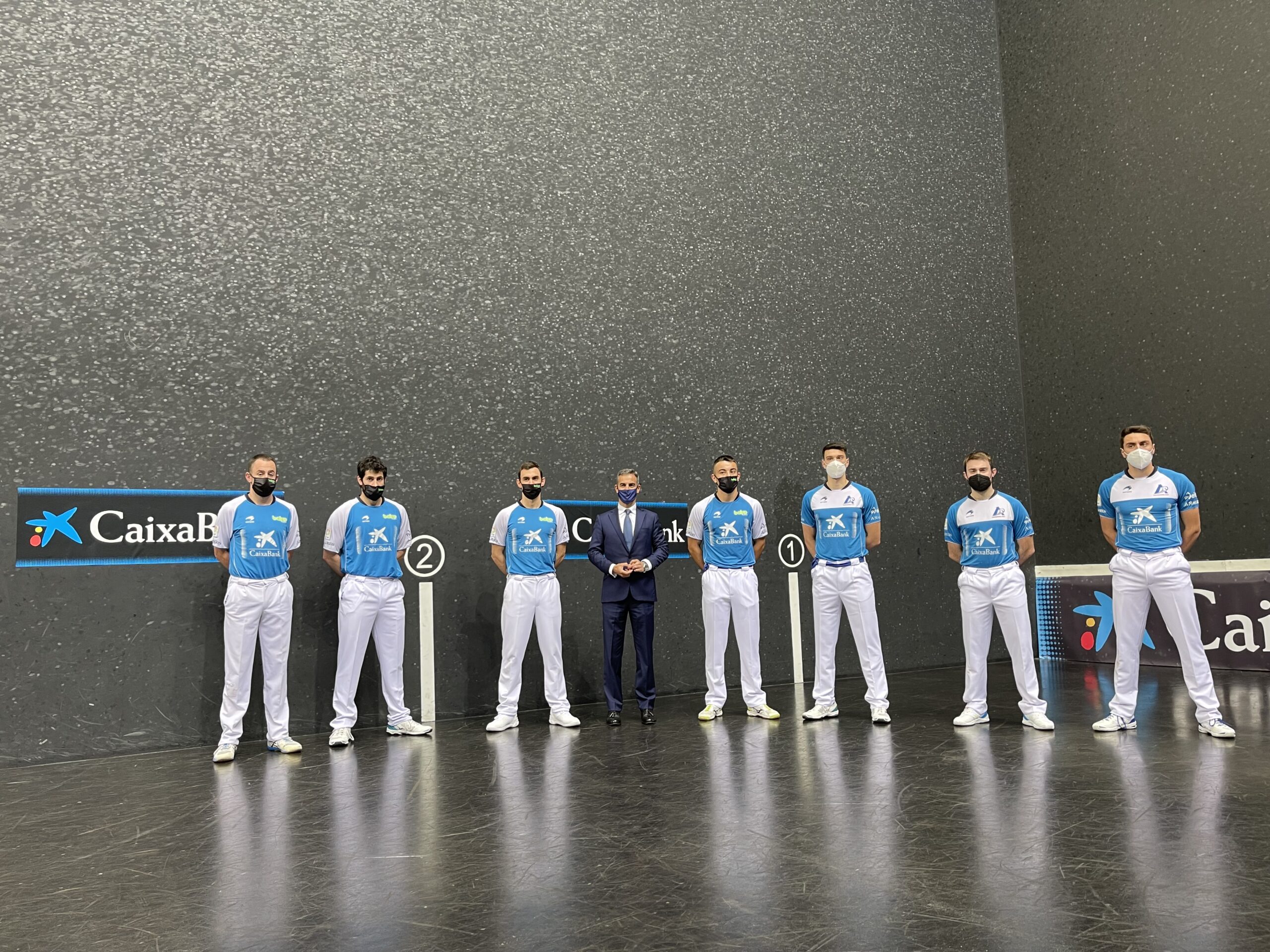 Bizkaia Frontoiko Prentsa Aretoan egindako aurkezpen ekitaldian parte hartu dute Emilio Cuadrado CaixaBankeko Bilboko Negozio Arloko zuzendariak, Unai Iglesias Baiko Pilotako ordezkariak eta Inaxio Errandonea ASPE Pelotako ordezkariak.