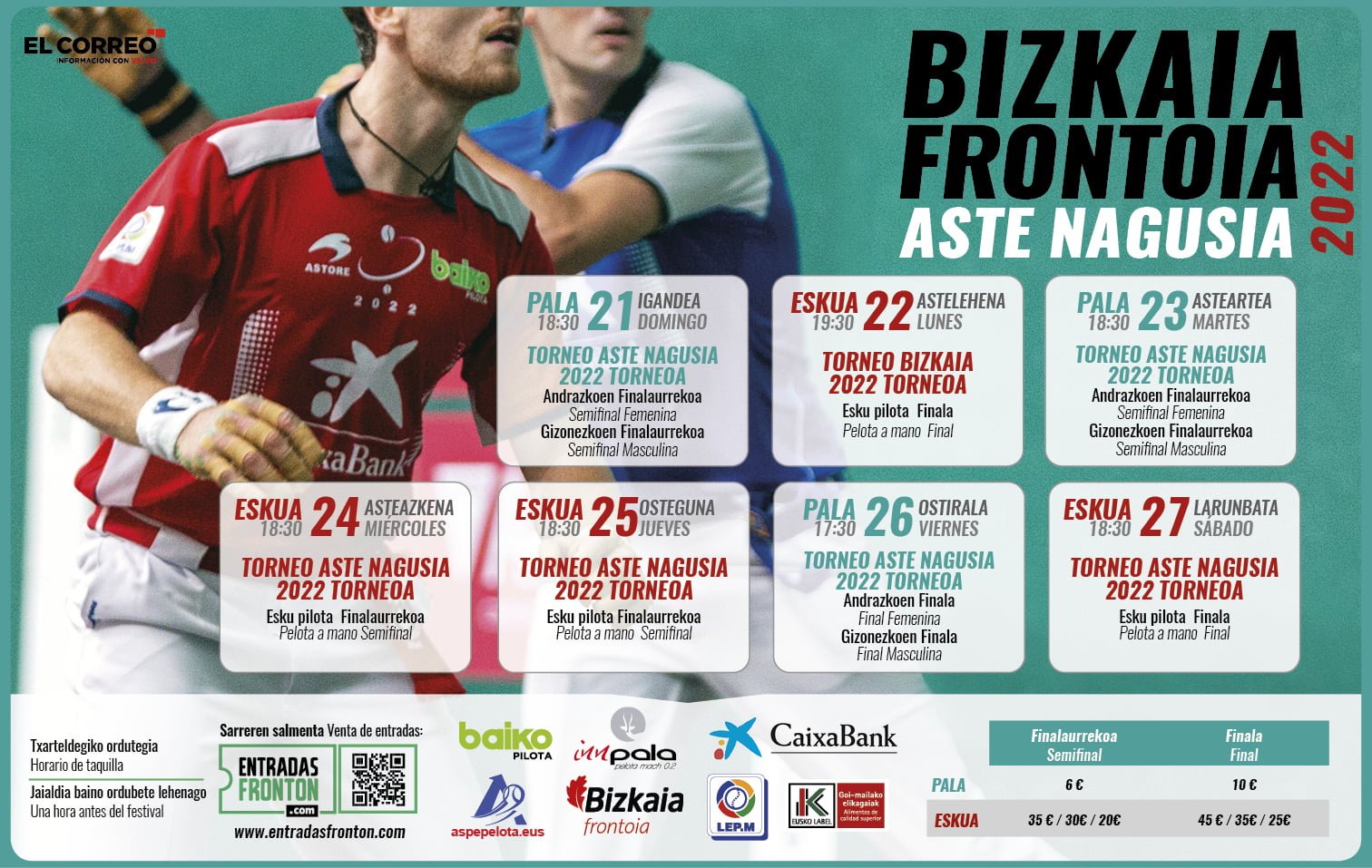Salgai daude dagoeneko Bilboko Aste Nagusia 2022 Torneoan izango diren hiru pilota jaialdietarako eta Bizkaia Torneoko finalerako sarrerak.