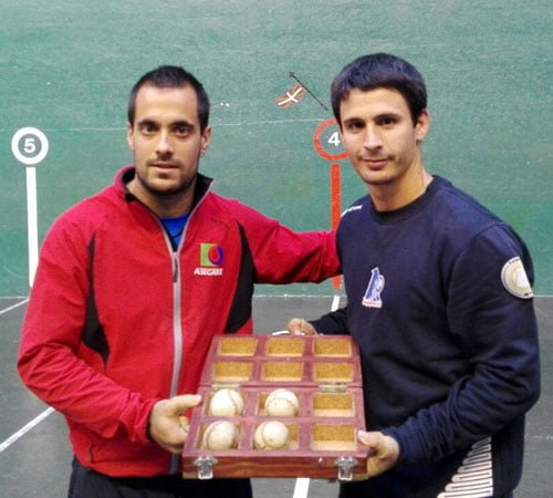 Tras extraer del cestaño los esféricos de su gusto, ambos pelotaris