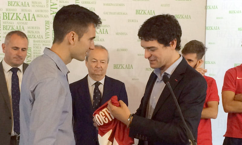 En la foto superior se puede ver como Urrutikoetxea entrega su camiseta al Diputado General de Bizkaia, Unai Rementería.