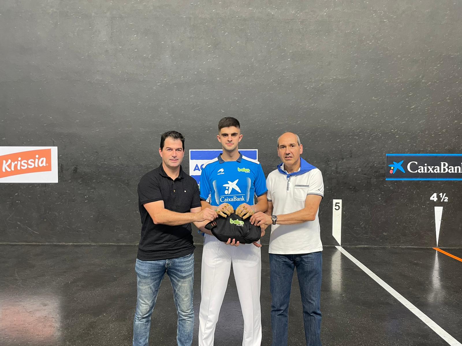A esta cita tan importante para el joven zaguero también ha acudido Unai Iglesias, responsable comercial de Baiko Pilota, para reunirse con los representantes del club de pelota Lagun-Onak, que ha visto crecer a Morgaetxebarria como pelotari, y les ha hecho entrega de varios lotes de pelotas que servirán como ayuda para la formación de los y las jóvenes pelotaris.