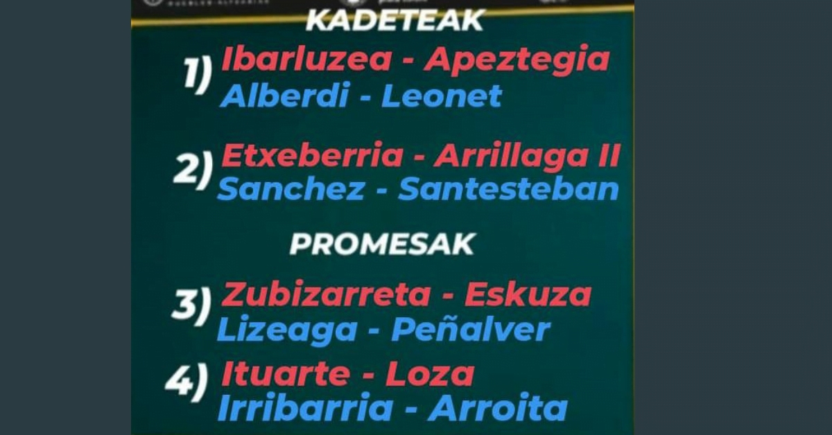 Y en promesas, las parejas clasificadas son Zubizarreta-Eskuza vs Lizeaga-Peñalver e Ituarte-Loza vs Irribarria-Arroita.
